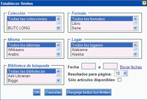 Vea Búsqueda de palabra clave, Consultar, Avanzada o Artículos nuevos para las opciones de búsqueda en que se puede usar Establecer límites.